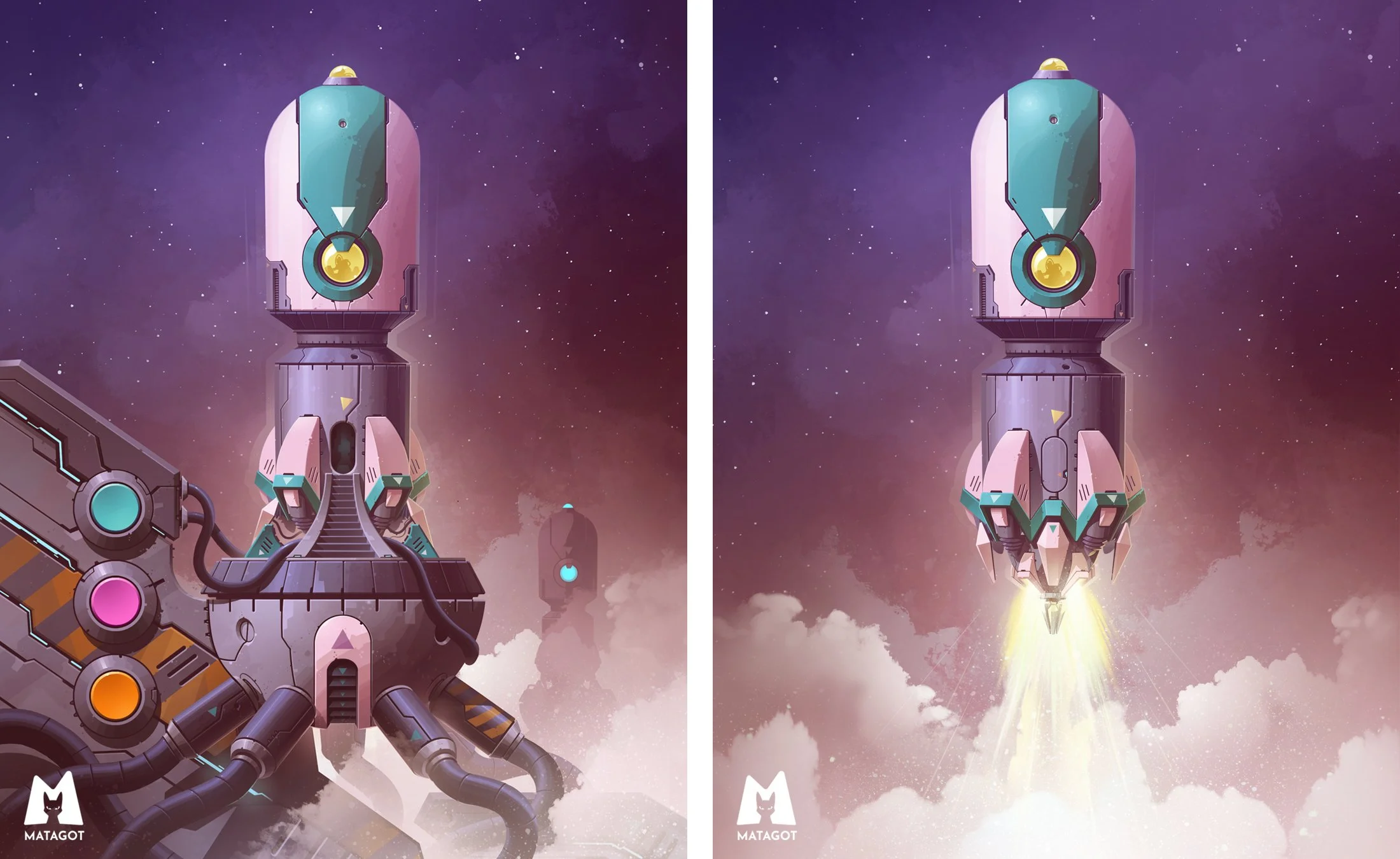 Card art for the Launch Pad and the Rocket/Extractor for the board game Mission: Red Planet. As the gameplay centres around colonizing and extracting resources from Mars, the players have to get their miners up into space and over to the red planet. That is where these cards come into play.